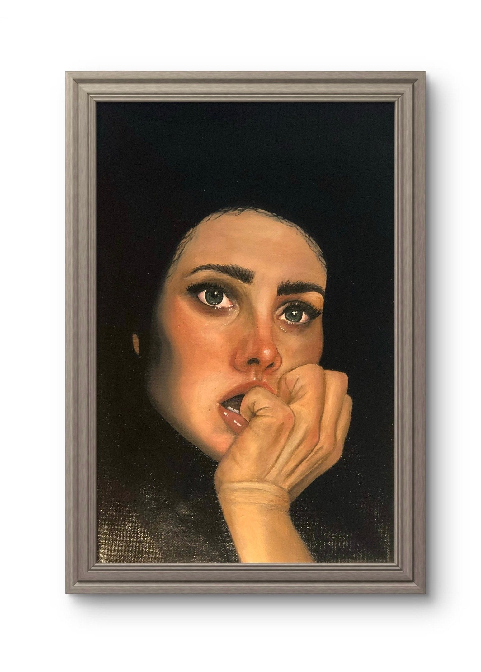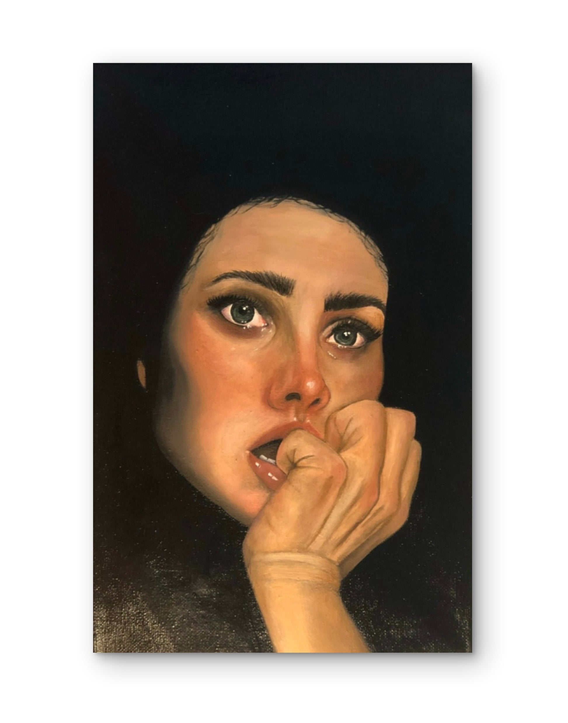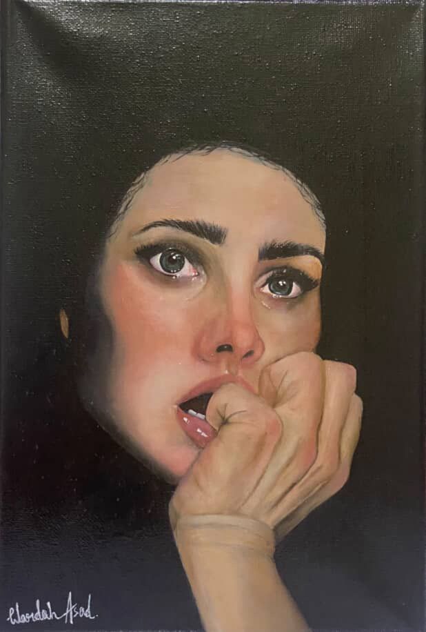 This oil painting portrays a woman gripped by fear. Her wide eyes convey tension and vulnerability, capturing a raw and intimate emotional moment.