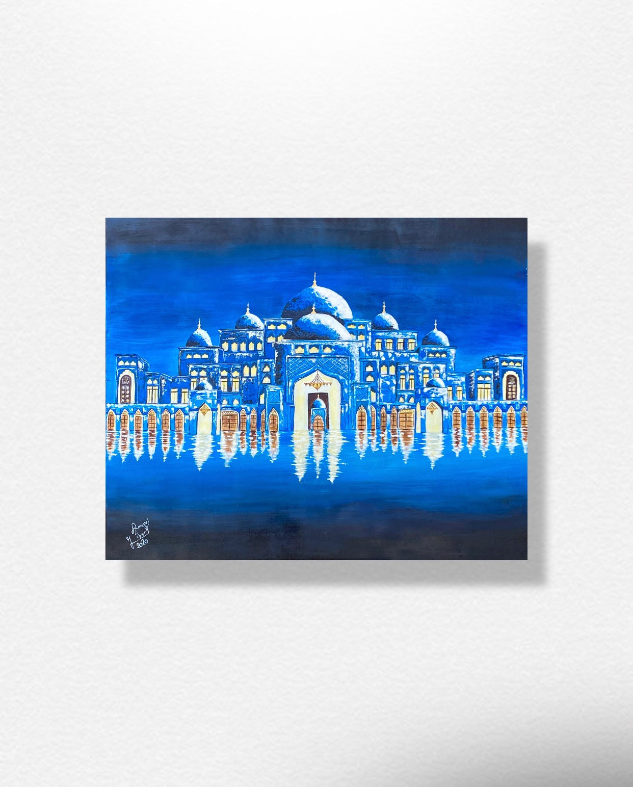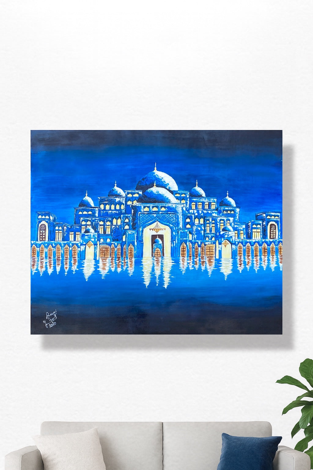 This artwork, painted with acrylic colors, uses deep blues to symbolize peace and wisdom, while the reflective effect highlights Qasr Al Watan’s grandeur, with glowing tones that make the palace shine with brilliance.